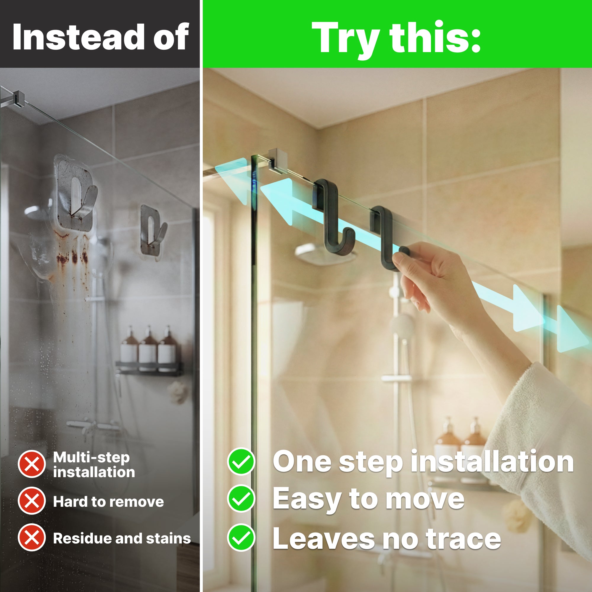 These hooks require no tools or adhesives. Simply hang them over your shower door to instantly expand your storage space, making your morning routine smoother and more efficient.