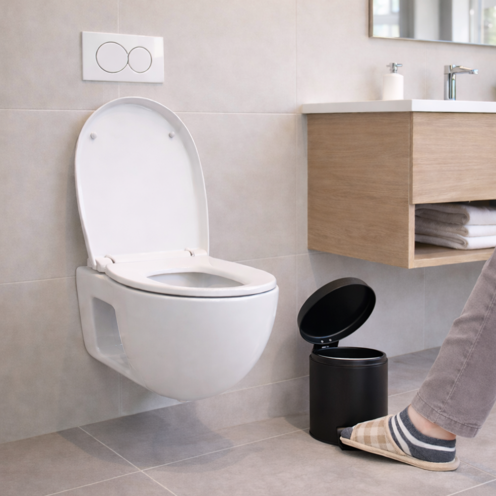 Designed for compact spaces, this pedal bin fits neatly next to the toilet or under a sink without taking up unnecessary room. The soft close lid shuts quietly and smoothly, helping maintain a calm, clean atmosphere in your bathroom. The pedal mechanism allows hands free use, making it more hygienic for daily routines.