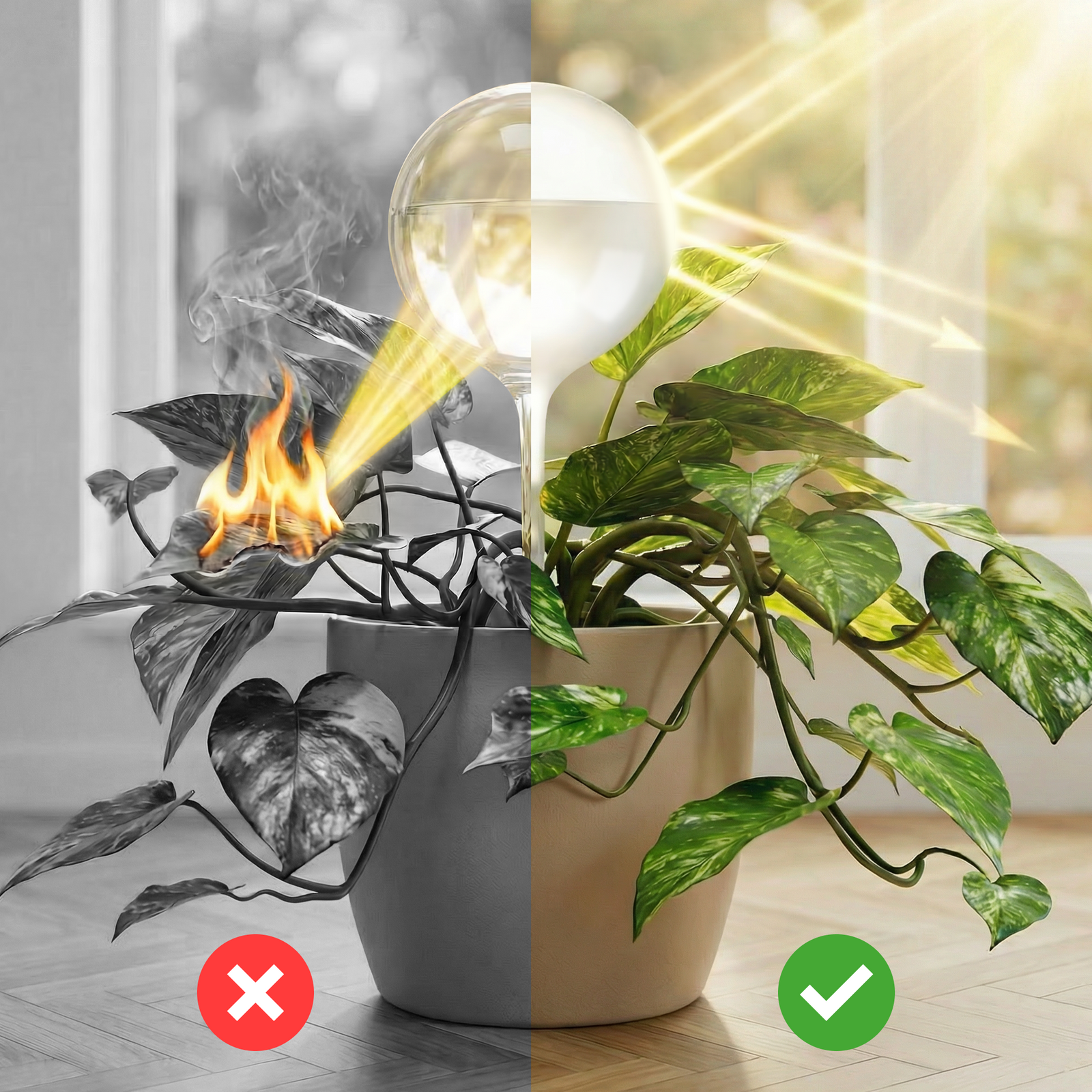 De meeste waterdruppelaars zijn gemaakt van helder glas of transparant plastic. Bij direct zonlicht werken ze als een vergrootglas en kunnen ze je plant of omgeving beschadigen. Onze matte afwerking weerkaatst het licht in plaats van het te bundelen. Geen brandpunten, geen verschroeide bladeren, geen risico.
